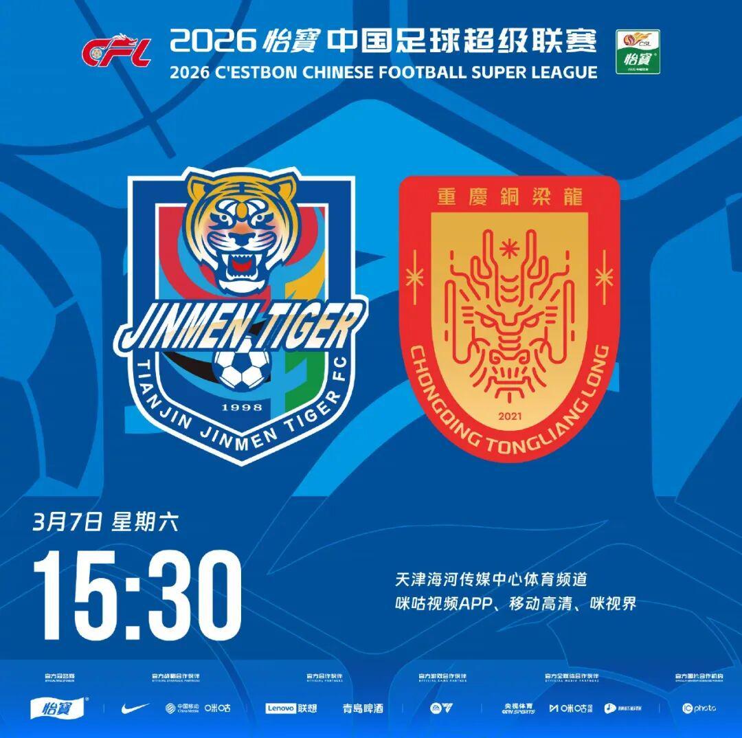 3月7日15点30分,2026赛季中超联赛首轮,天津津门虎对阵升班马重庆铜梁龙的比赛在天津泰达足球场进行,目前本场比赛的首发替补名单已经正式出炉!