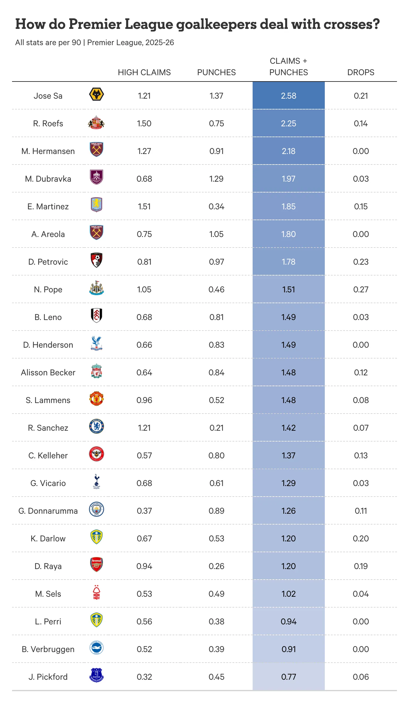虎扑04月08日讯 The Athletic UK撰写数据分析专栏,英超门将是如何应对传中的?