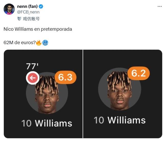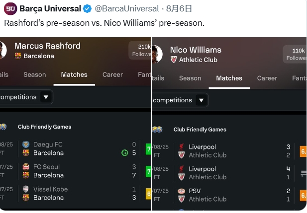据eldesmarque披露,此前尼科续约后的热身赛表现曾遭网友质疑,更有巴萨球迷账号将其与曼联前锋拉什福德的季前赛数据进行对比。